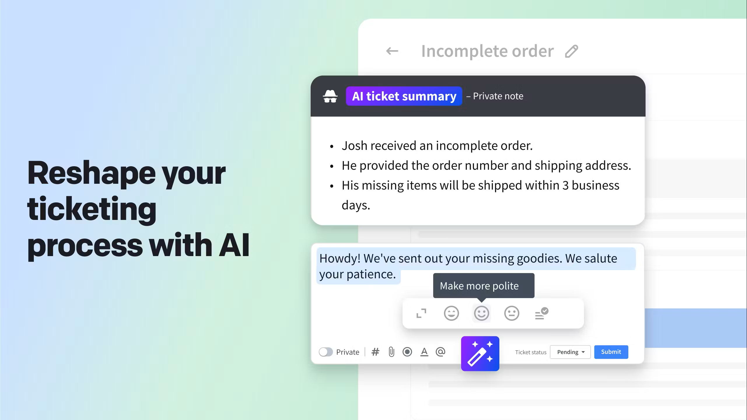 - Elaborazione di risposte personalizzate da parte dell'IA in base alle richieste specifiche, garantendo coerenza in termini di tono e linguaggio. Fornisce articoli pertinenti, articoli della knowledge base e un contesto basato sulla conversazione in corso. Gartner prevede che entro il 2025, l'80% delle organizzazioni che si occupano di assistenza clienti avranno adottato soluzioni basate sull'IA generativa. [2]